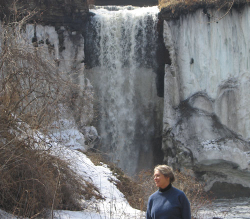 The next day we went out to Minnehaha Falls. There is a statue of the couple from Longfellow's epic poem. It depicts the noble Hiawatha carrying his beloved. Her name actually means waterfall. This is many miles from the shores of Gitche Gumme, better known as Lake Superior, and even further from the annual pageant that still retells the romantic tale. Still, here they are, in all their timeless sorrow. As we hiked around, the air was so cold the falls were surrounded by dramatic curtains of ice from the frozen mist. Below the drop, Minnehaha Creek meanders through a narrow gorge carved out of limestone and sandstone on its way to find the big river.